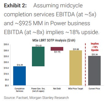 2-year target: LBRT anaylsts are valuing the stock based on its end-of-2028 3GW deployment target (see below) and applying a ~8x multiple to it. LBRT stock price largely reflects this today. They have only contracted ~750MW so far (zero deployed). To be clear, 3GW is a target - not a contracted number. I value PUMP on a 2-year-view (Jan 2028) which would be looking at end-of-2030 1.5GW deployment for PUMP. So PUMP will deploy 1.5GW by 2030 (can be easily viewed as conservative given that at the current first-year run-rate they’ll hit 1.4GW), discounted back to a Jan 2028 PT just as the LBRT valuation is an end-of-2028 target discounted back to Jan 2026.
