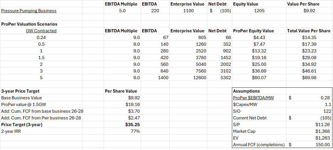 The economics and growth potential in ProPwr are distinct and far superior to the legacy completions business. I forsee significant growth in ProPwr. I believe that ProPwr alone could be worth >$30/share within 3-5 years. The current market cap is incorporating almost zero value for the ProPwr business today despite its phenomenal success over the last 12months. My 2-year base case is ~$35.