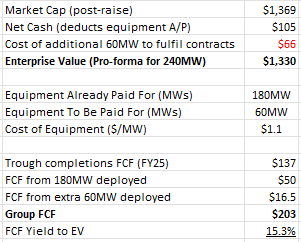 The 240MW scenario (what we’ve currently contracted) gets us to a stock price above the current level. That is to say: the recent move in the stock price has not even reflected what we’ve contracted let alone upside from here.